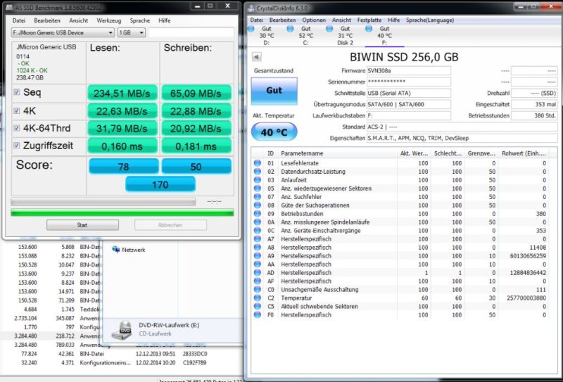 TRIM ist halt bei IDE nicht aktiv, man kann nur manuell TRIM anstoßen, das werde ich dann einmal täglich oder so per Zeitplan machen. Der Laptop wird sowieso nur für Surfen, Banking etc. benutzt, also reicht auch der Speicherplatz masse und die Schreibzugriffe bleiben gering. Und die SanDisk reizt IDE mit maximal 100MB/s sogar noch voll aus. Ist halt fast 50% Unterschied zur 120GB 850 Evo.