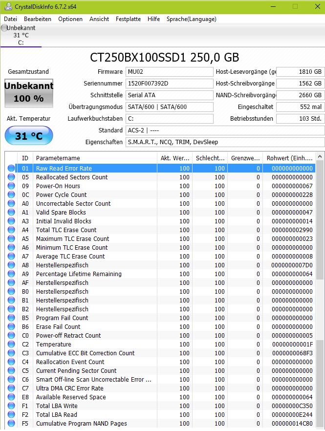 CrystalDiskInfo kennt viele Namen der Attribute von den SMI Controllern nicht, denn die Namen der Attribute kommen ja nicht vom Controller, die muss das Programm welches die Werte ausliest selbst kennen. Nimm im Zweifel das Tool von Crucial.