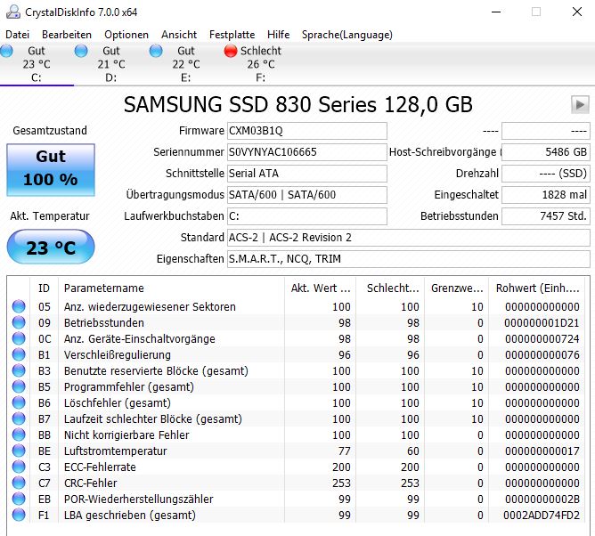 Da ist alles in Ordnung, die SSD ist noch fast neu (96% der spezifizierten P/E Zyklen sind noch übrig, wenn Du die 2 Jahre hast, würde es noch 48 Jahre dauern die zu verbrauchen, ist sie schon 4 Jahre alt, gar noch 96 Jahre). Die HDD hat einen Schreib- und ein paar Lesefehler (die aber offenbar korrigierbar waren), aber das kann schon durch Vibrationen oder Stöße mal passieren, also kein Grund zur Sorge.S-Bock schrieb:Wichtig wären diese beiden![]()