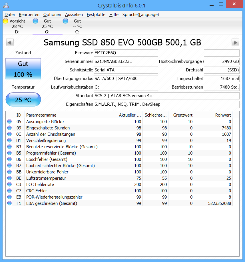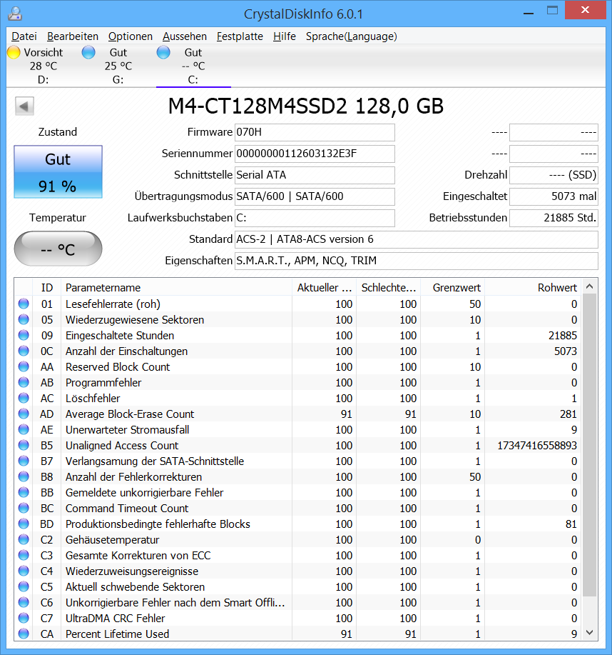 genocide7, die SSDs sind in Ordnung, ohne den einen Löschfehler bei der m4 wären die S.M.A.R.T. Werte bestens, aber sowas kann als Folge eines unerwarteten Spannungsabfalls schon mal passieren und davon gab es ja auch ein paar. Poste auch mal den Screenshot für Laufwerk D:, da warnt CDI ja. Welches Windows hast Du denn? Wenn es Win 7 ist, musst Du vorher noch den Support für NVMe vor dem Klonen nachrüsten können. Außerdem kann es dem Klonen einer Installation von einer Platte mit Defekten generell zu Problemen kommen und auch danach läuft das Windows nicht immer stabil, man sollte danach zumindest einmal sfc /scannow ausführen.