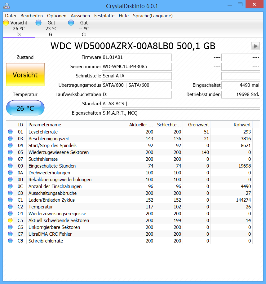 Die 14 schwebende Sektoren sind noch nicht dramatisch. Schwebende Sektoren sind Sektoren deren Daten nicht mehr zur ECC passen die hinter jedem Sektor steht und mit deren Hilfe auch nicht mehr korrigiert werden können. Da die korrekten Daten nicht mehr feststellbar sind, gibt die Platte statt falscher Daten einen Lesefehler als Antwort wenn man versucht diese zu lesen. Das kann auch anderen Gründe als defekte Oberflächen haben, z.B. einen Stromausfall (es gab 27) während eines Schreibvorgang der dazu führt, dass eben nicht die ganze Daten plus der neuen ECC geschrieben wurden oder wegen eines Stoßes oder Vibrationen ist der Kopf beim Schreiben aus der Spur gekommen und hat Daten auf der Nachbarspur überschrieben. Auch arbeiten HDDs nicht 100%ig und die Hersteller geben die Fehlerhäufigkeit auch in Form der UBER an, wobei eine UBER von 1:10^14 bedeutet, dass je 10^14 gelesener Bits was etwa 12TB gelesener Daten entspricht, ein Lesefehler und damit schwebender Sektor im Rahmen der Erwartungen liegt.