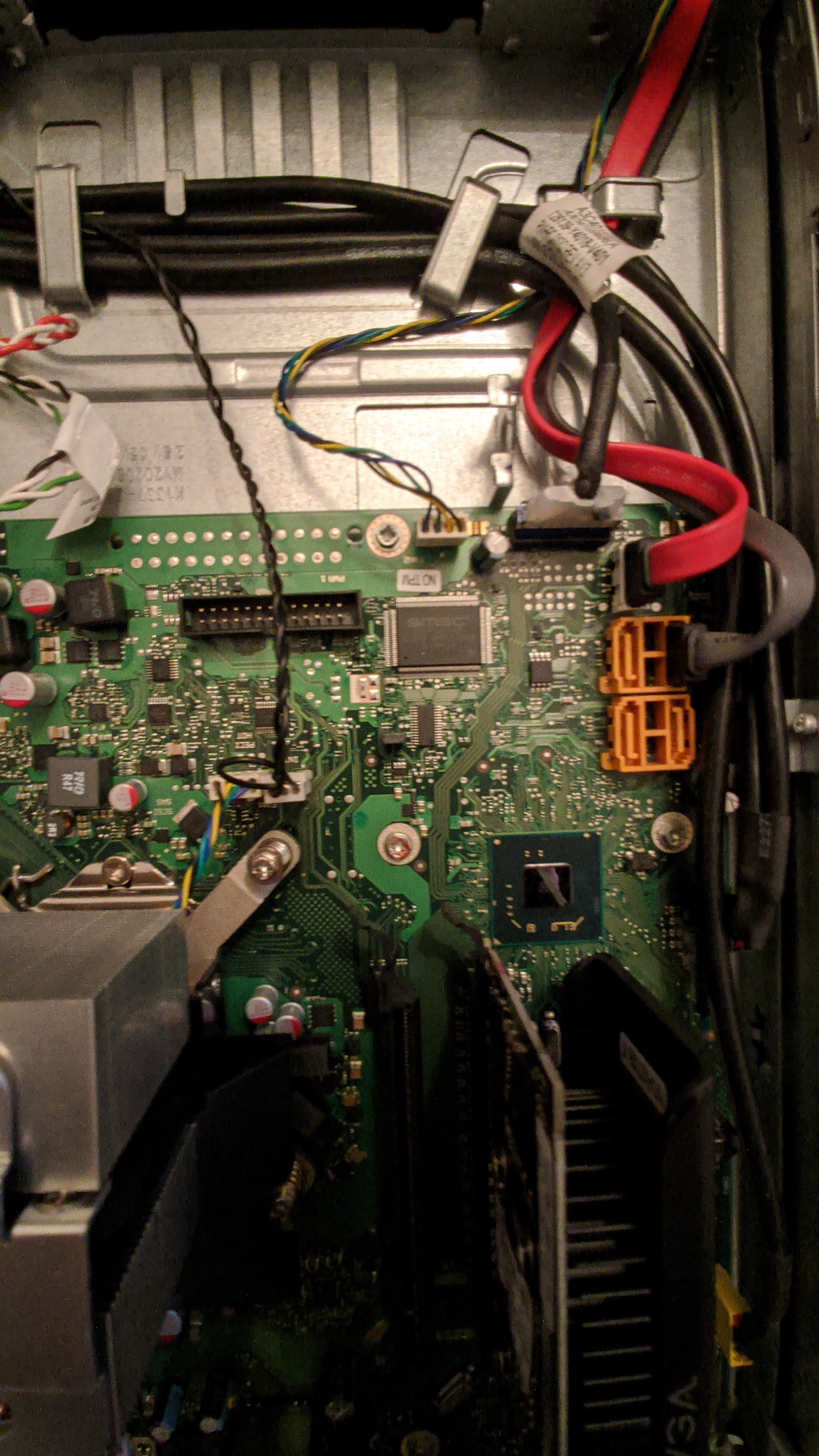 In einem der vier orangenen SATA-Ports steckt bereits ein graues SATA-Kabel, das zum optischen Laufwerk führen dürfte, das rote Kabel im grauen SATA-Port darüber führt zur HDD.