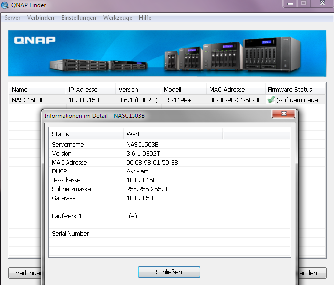 Im QNAP Finder tauchte die SSD zwar zunächst auf, verschwindet dann aber während der Einrichtung. (Bild 3)