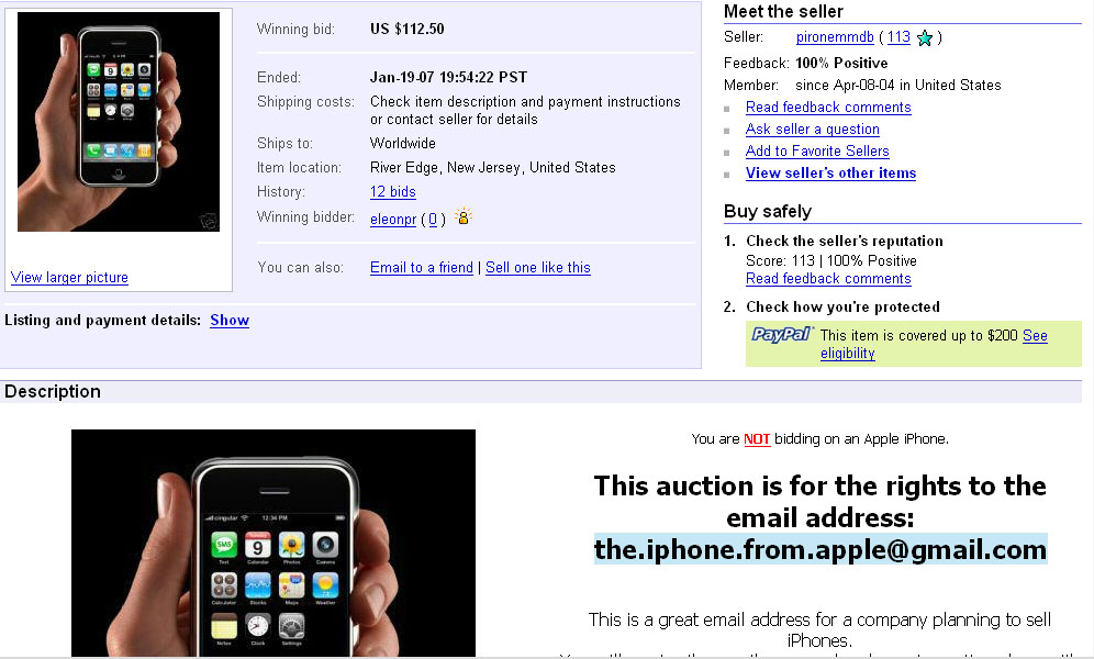 e-Mail Adresse versteigert - Die e-Mail Adresse the.iphone.from.apple@gmail.com wurde um 112,50$ versteigert.