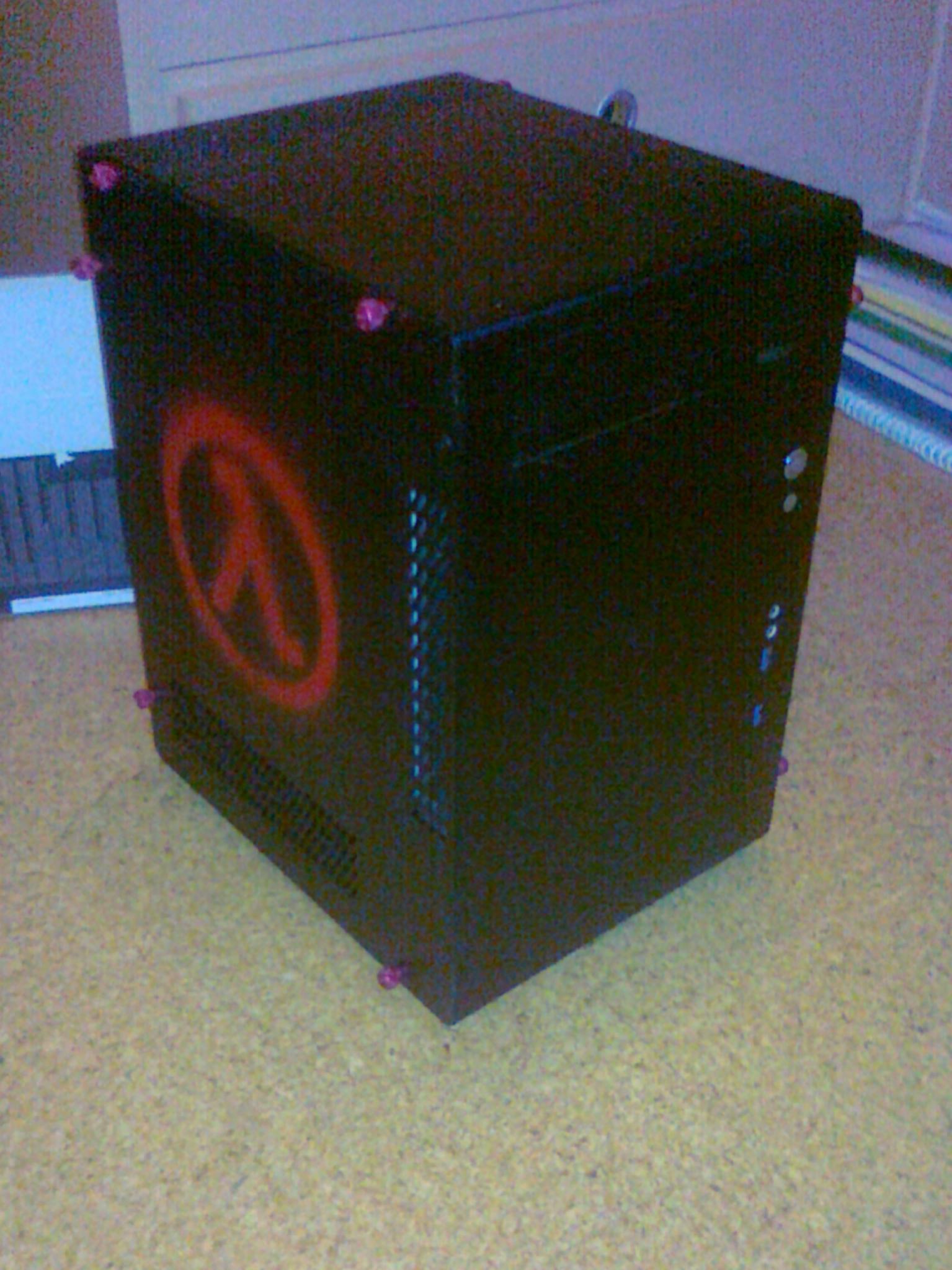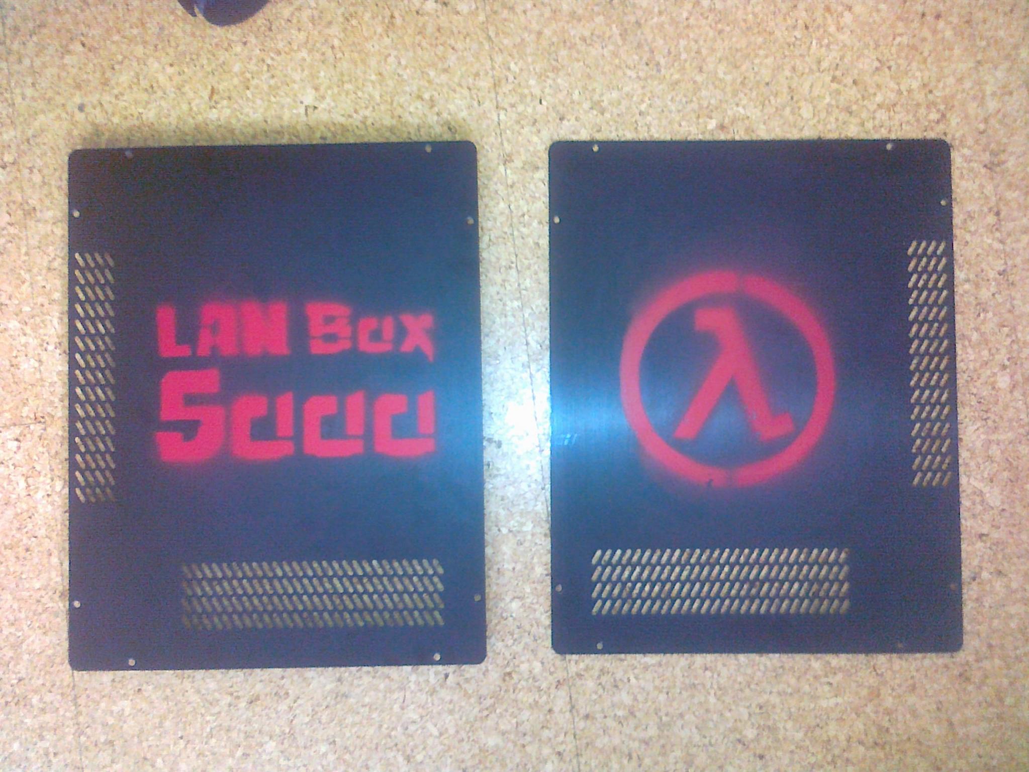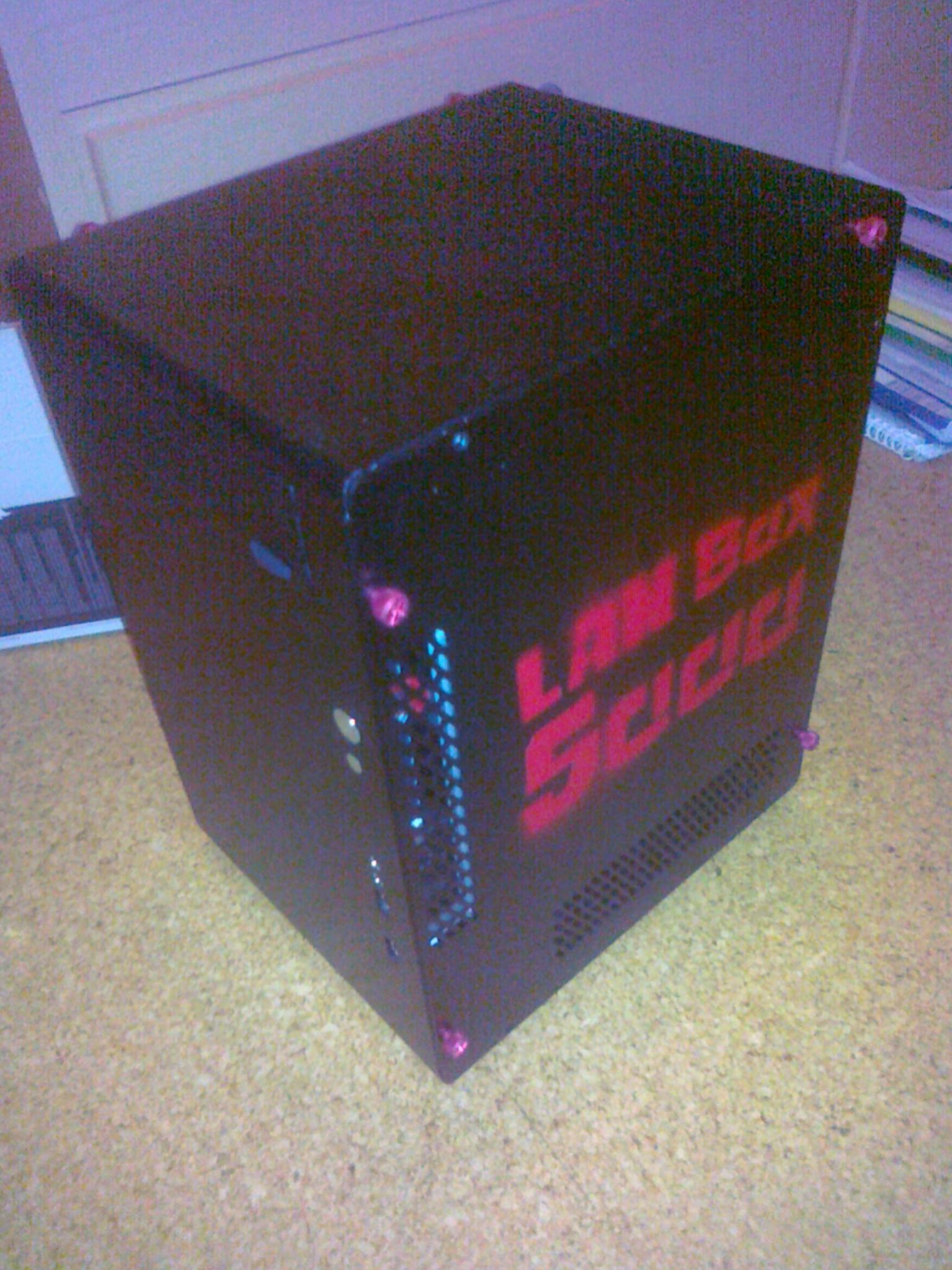 Zum optischen: Den Gehäuselüfter habe ich durch oben angegeben 140er ersetzt, der mehr Luftdurchsatz hat und nett rot leuchtet. Ich habe das Gehäuse zusätzlich mit nem Lambdasymbol links und dem Schriftzug "LANBox 5000" rechts rot bepaintet. Ausserdem habe ich mir rote Rändelschrauben für aussen besorgt, um weiter den rot-schwarz-Stil einzuhalten. Und nein, @Peter_Shaw, ich finde nicht, dass das sonderlich schlecht aussieht.