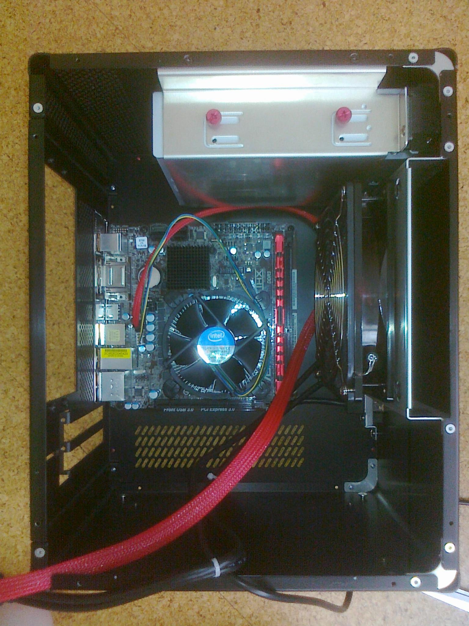 Die CPU läuft momentan noch auf dem Boxedlüfter, was sich vermutlich ändern wird. Das Ding röhrt schon gut rum und hält die CPU trotz 65er TDP im Idle bei 45-50°C. Ausserdem pustet es auf den Kühler und kann nicht gedreht werden. Da kommt auch schon die erste Frage -
