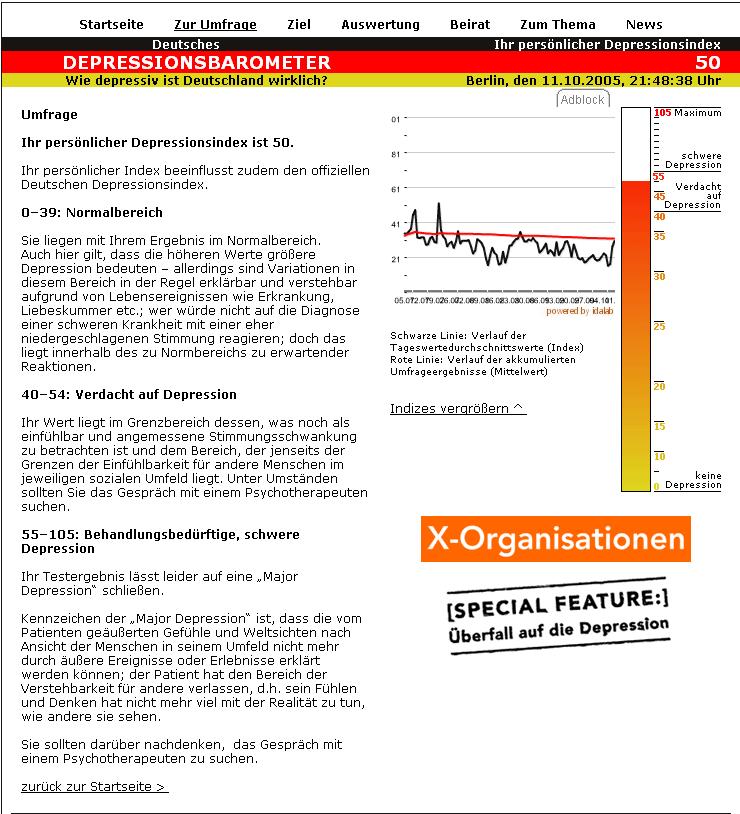 Das Depressionsbarometer find ich auch nicht so gut. Es lässt die Möglichkeit zu keiner Sekunde zu, dass es einem heute vielleicht sogar besser geht als früher, weswegen man ohne Zweifel auf jeden Fall am Ende als deprimiert dasteht, auch wenn man's nicht ist!