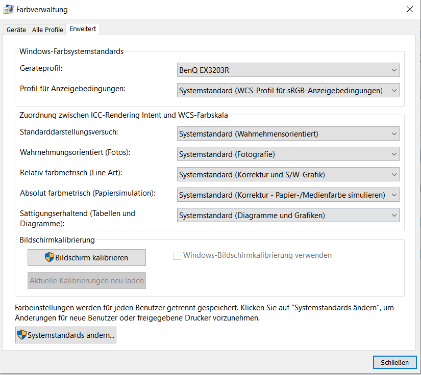 Meine Windows Farbverwaltung sieht derzeit so aus: