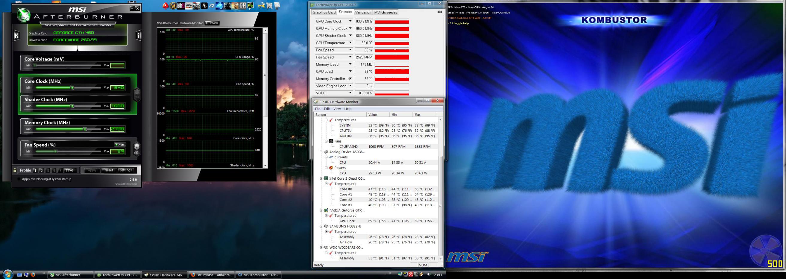 Allerdings fürchte ich wirst du mit der Spannung und den Taktraten nicht wirklich stabil sein, Kombustor ist nicht das perfekte Tool um stabilität zu testen (Thermisch ja, aber nicht bzgl. Rechenfehlern)