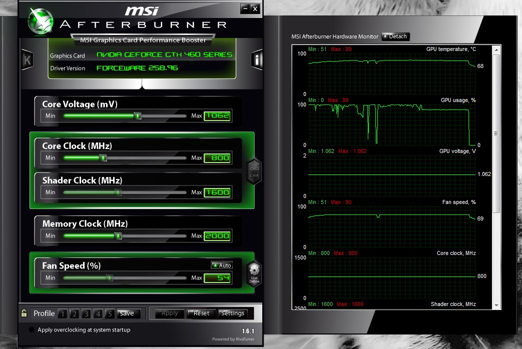 Dachte ich bis gestern noch mit 820 zu 2000 @ 1062mV (nach 30min. OCCT) eine stabile Konfig erreicht zu haben wurde ich am selben Abend nach etwa 1,5 Std. Mafia 2 eines besseren belehrt -> Grafikfehler, Spiel hing sich auf und Graka ging nur noch bis zum Low-3D Takt hoch.
