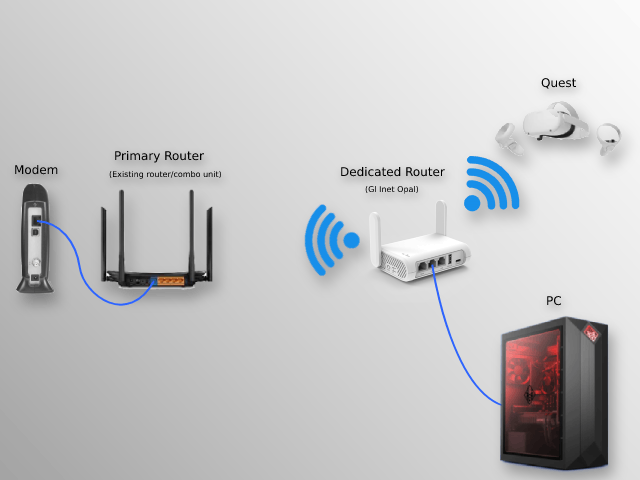 Das einfachste Setup hat natürlich nur einen Router, da dieser leider als Modem-Router oftmals im Keller/Flur/sonst wo steht, unten den Aufbau mit einem dezidierten VR Router illustriert. Je nach Router, muss der dezidierte Router im Access-Point-Mode entweder per WAN oder Lan 1 am Hauptrouter angeschlossen werden.