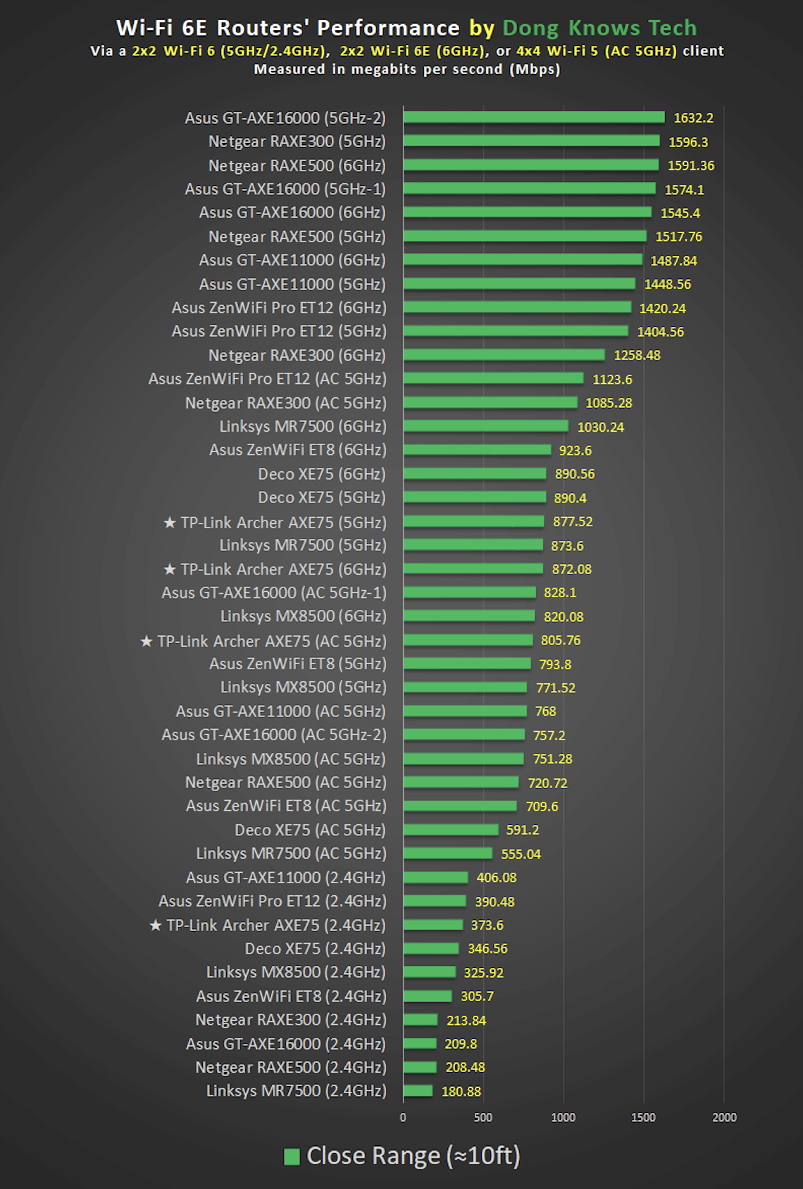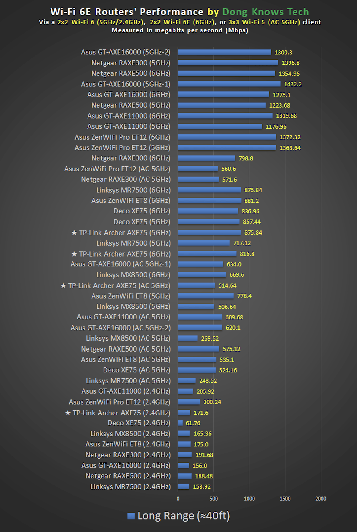 Als Beispiel mal ein Review zum TP-Link AXE75, und die entsprechende Vergleichstabelle (das Ranking ist gleich, links auf 10ft/3,30m, rechts 40ft/11m).