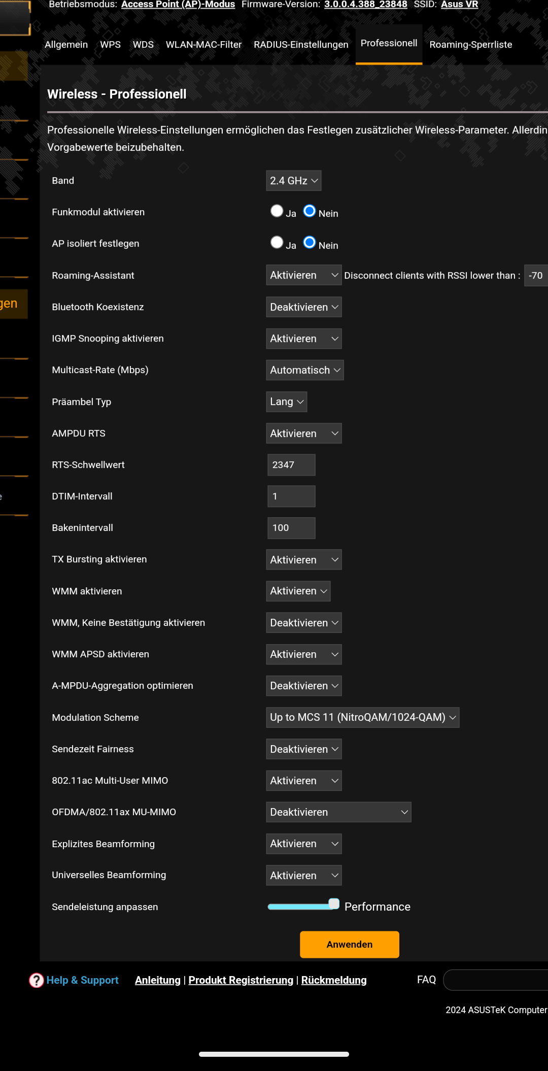Aus Spaß habe ich dann nochmal das Fritzbox WLAN probiert ( 5 GHZ, 300 - 700 Mbps) stark schwanken aufgrund der Entfernung aber spürbar (Startbildschirm ohne jeden Ruckler in bester Grafik) besser als die Konstanten 5GHZ 2400 Mbps von der Asus Box.