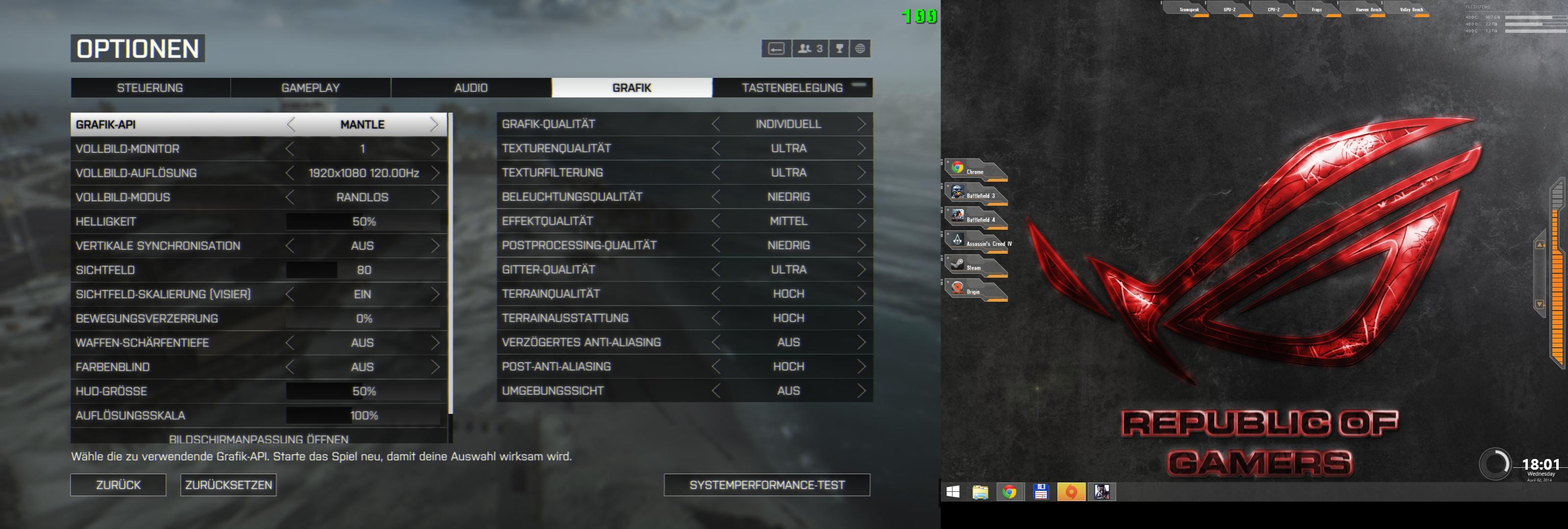 Ich habe grade noch einmal getestet sowohl unter Mantle als auch dx11 ohne GPU-Z und hatte so im Schnitt 55fps, max 80 und die meisten drops gingen auf 45fps einer mal auf 32 oder so. Ganz ehrlich subjektiv gesehen finde ich läuft es unter dx11 sogar flüssiger vll. 1-4 fps mehr im Schnitt und seltener die drops.