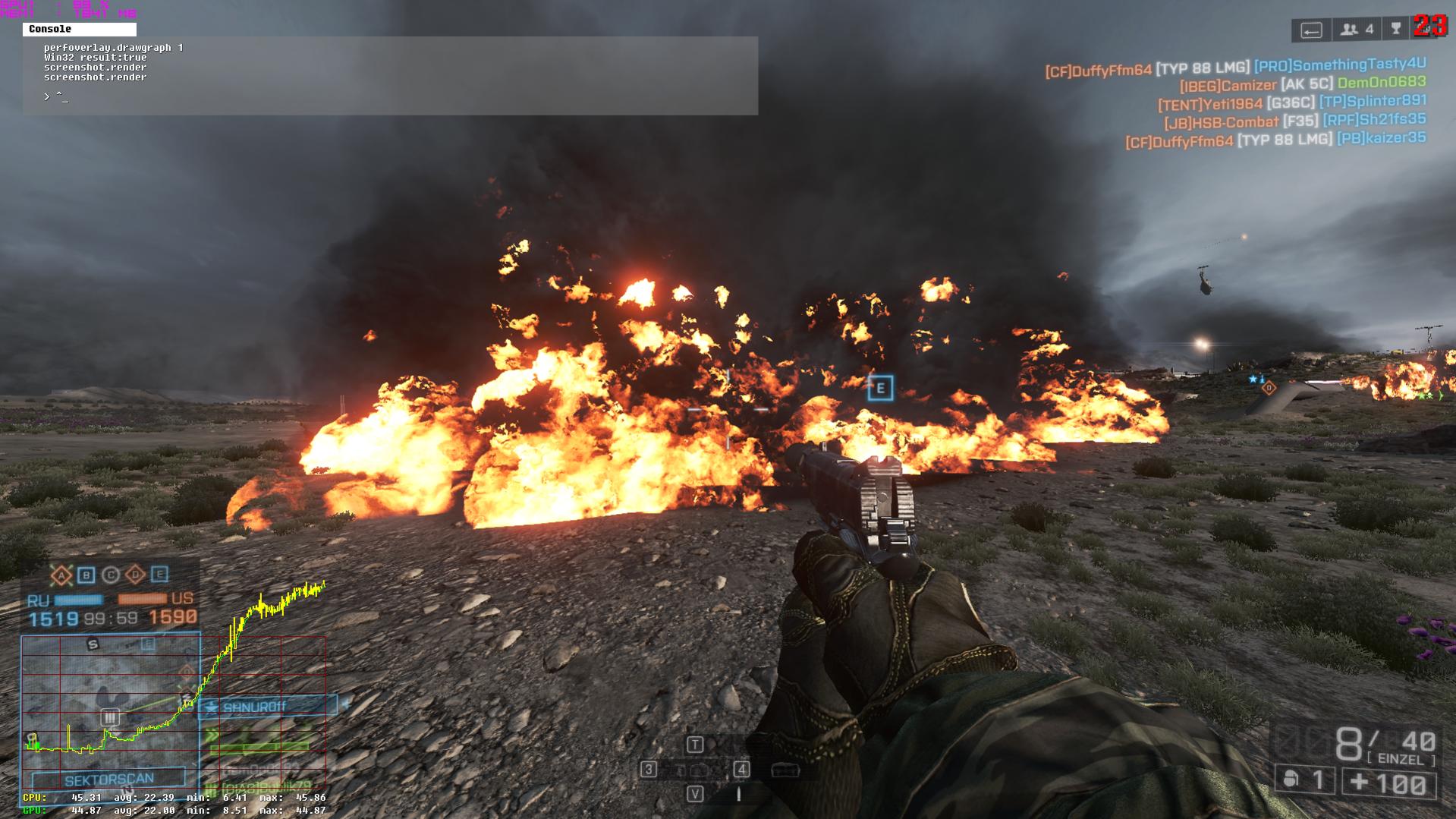 20FPS vor den Flammen CPU 30-40% Auslastung und GPU 99%