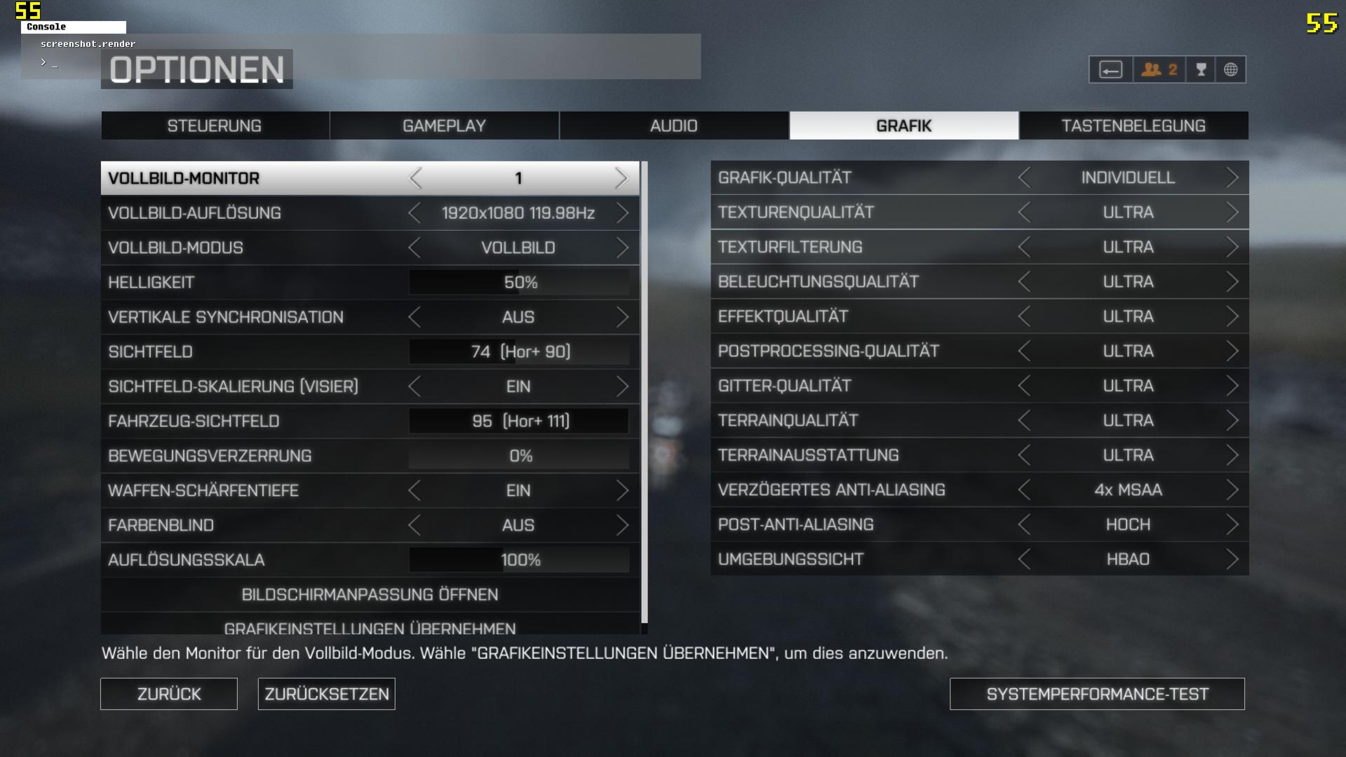 @Bublik: Ja, sind die gleichen Settings, bis aufs Sichtfeld! Ist bei mir auf 71. Mantle muss ich gleich testen, hab das bisher nur mit Vsync probiert was ja sinnlos ist.