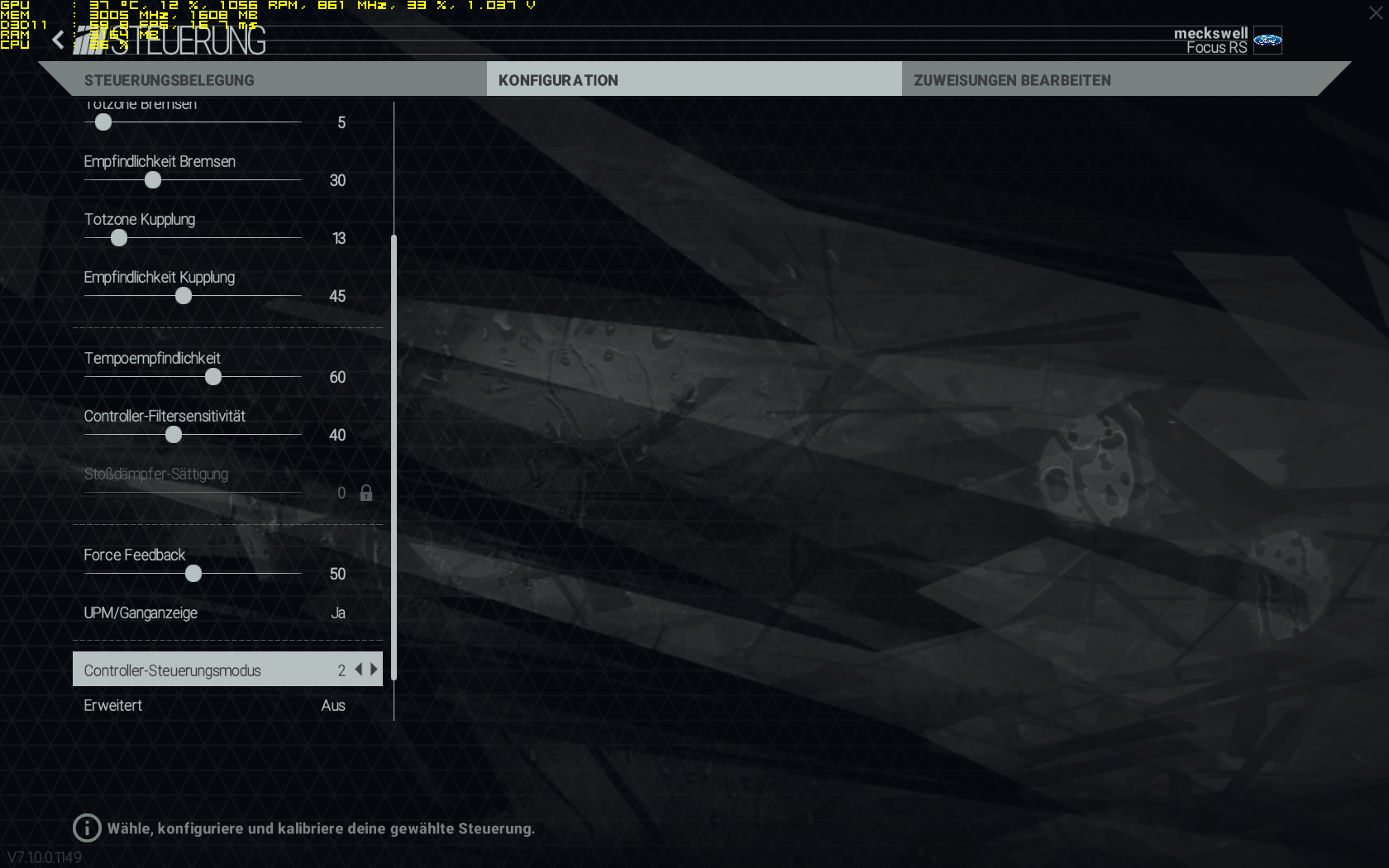 Ich hab das 360er Pad, hier mal meine Settings, vllt kannst noch was optimieren. Ganz wichtig im dritten Bild unten "Controller Steuerungs Modus 2" verwenden. Hab mal gelesen, das würde Settings beeinflussen, auf die man nicht direkt im Menü Zugriff hat. Kein Plan, ob es stimmt, es fährt sich aber sehr gut damit.