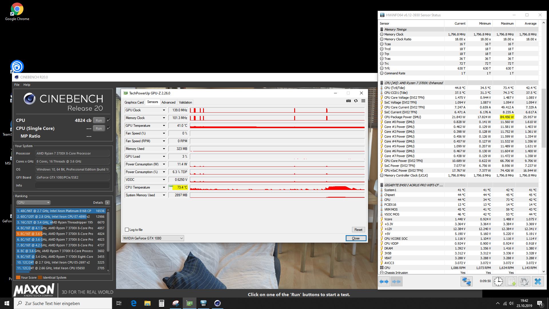 Hier exemplarisch der Cinebench R20. Spiele kann ich leider nicht vergleichen, da die GTX 1080 einer RTX 2070 Super weichen musste.