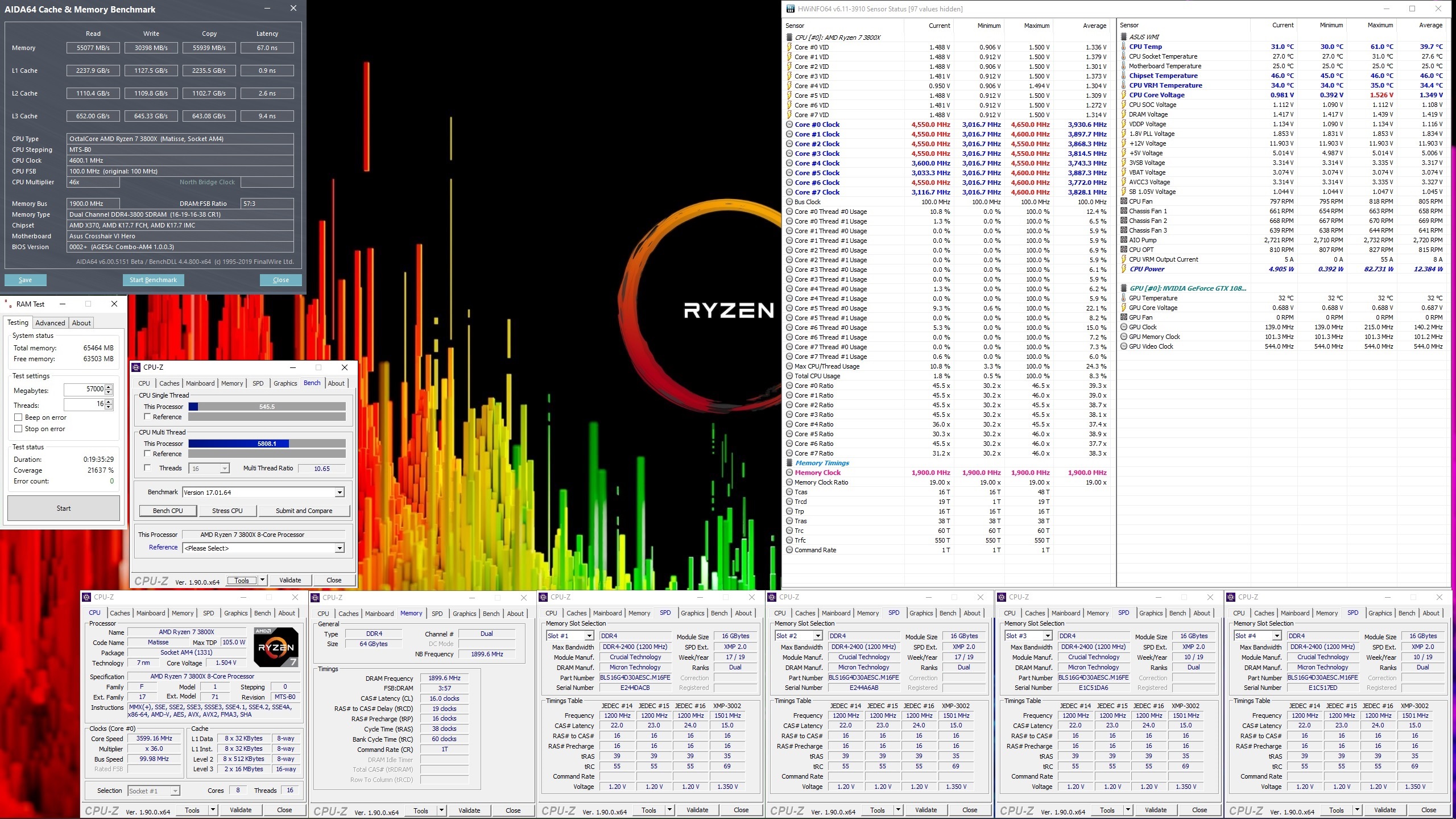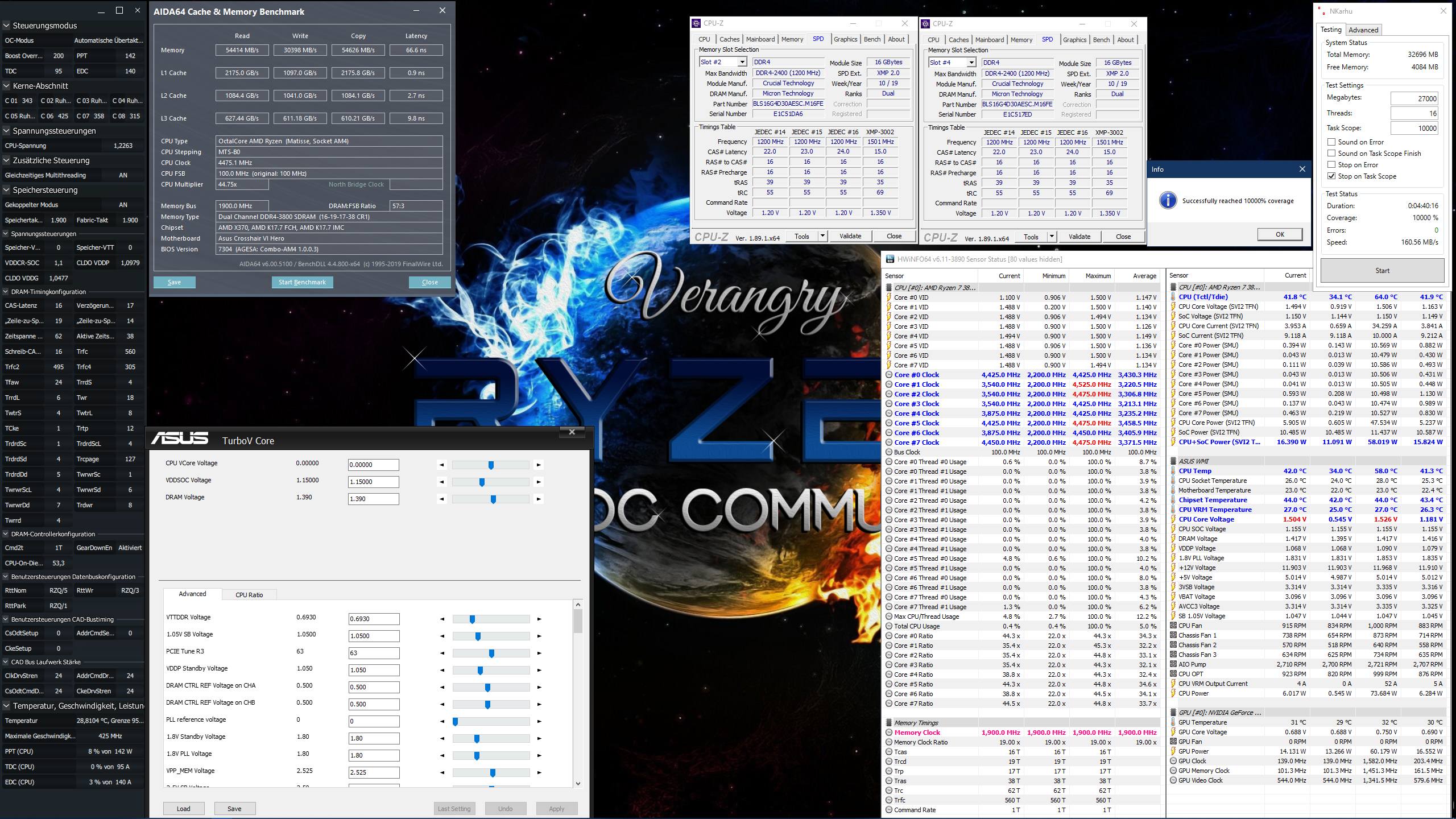 Das o.g. Profil war umgehend 20.000% Karhu-stabil, lief 6 Stunden mit CPU, FPU, Cache und Memory durch Aida64 und wurde dazu noch ausgiebig mit The Witcher III und Assassins Creed Odyssey getestet.