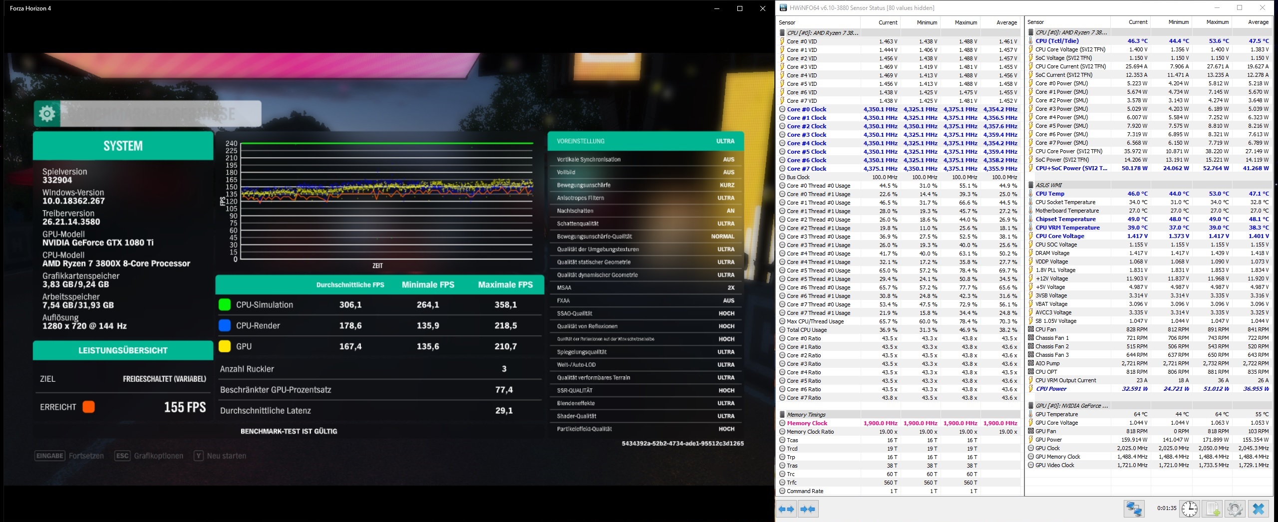 Dieses Bild bestätigte sich auch beim Spielen im CPU-Limit. Der 3800X schafft im Schnitt 15-20 Prozent mehr fps im CPU-Limit liefert deutlich höhere Min.- und Avg.-fps.