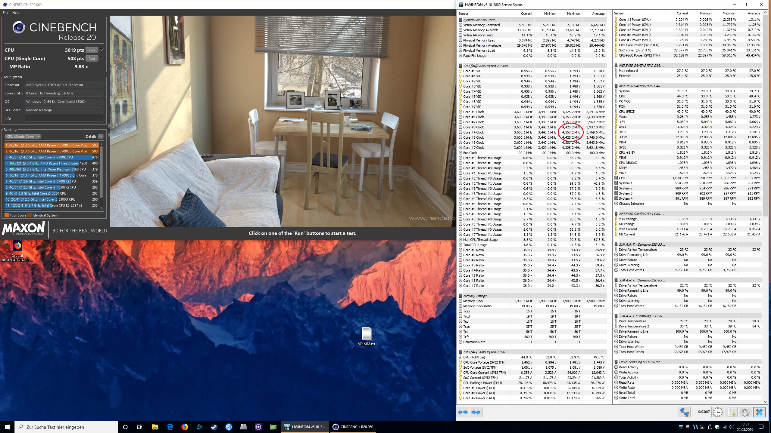 Randnotiz: Der 3800X boostet im Singlecore-Test auf bis zu 4,525 GHz, all Core werden die Kerne im Multicore-Test auf 4,375 bis 4,425 GHz beschleunigt. Das gilt sowohl für Cinebench R15 als auch für R20.