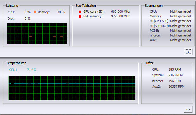 Edit: Habe nochmal eine etwas höhere Taktung versucht. Da ich grad nicht so viel Zeit habe, habe ich nur den nVidia Stresstest genutzt. Die Temperatur hing bei rund 71 Grad und ging runter auf 68 wenn der Lüfter richtig Dampf gemacht hat