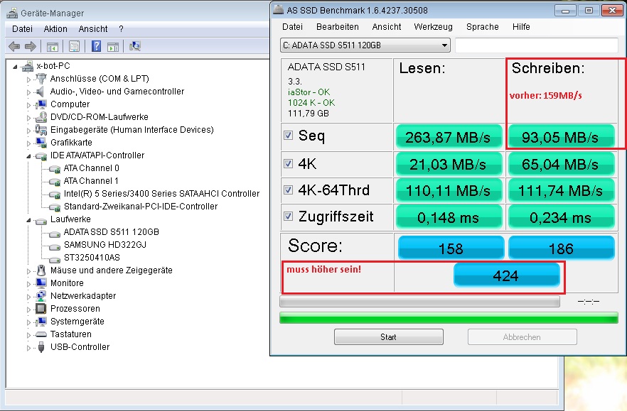 Sieh dir mal meine Werte drei Seiten vorher an. Ich hab die 60 GB Variante. Deine sehen ja schonmal besser aus als meine. Allerdings ist meine SSD zu knapp 70 % befüllt. Wie siehts da bei dir aus? Ich denke mal daß deshalb die Werte so ausreißen.
