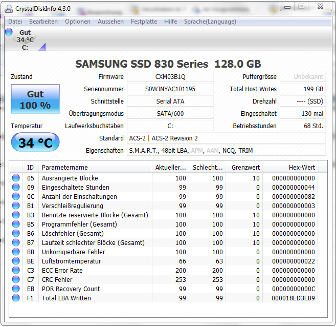 Die Temperatur zeigen die wenigsten SSD an und wenn, dann ist die oft auch noch entweder falsch oder gleich fest eingestellt. Die spielt bei SSDs aber auch keine wirkliche Rolle, da die selbst einmal viel weniger Wärme erzeigen und dann auch kaum Wärmeempfindlich sind. Mach Dir darum also mal keine Sorgen.Axelreborn schrieb:Habe mal einen Screenshot gemacht mit Crystaldiskinfo... Leider bekomme ich nur nicht alles angezeigt wie Temperatur.