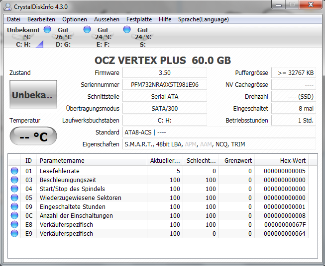 Habe mal einen Screenshot gemacht mit Crystaldiskinfo... Leider bekomme ich nur nicht alles angezeigt wie Temperatur. Bin noch nicht dazu gekommen nachzuschauen an was das liegt.