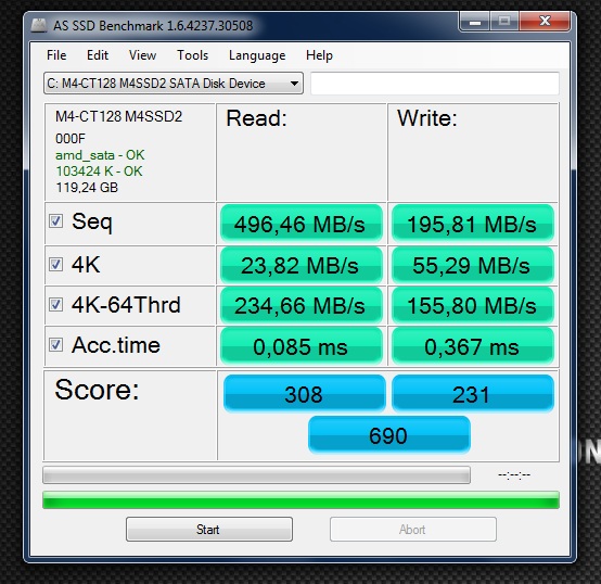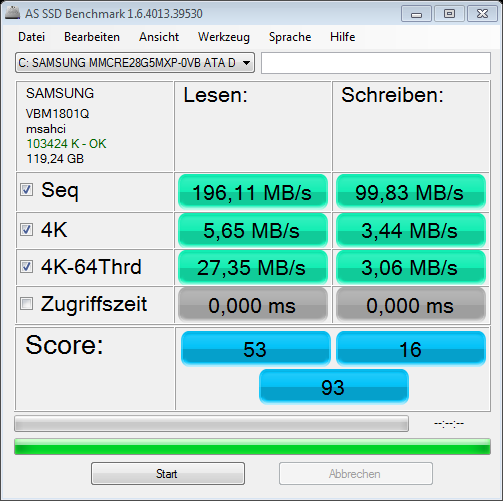 Das Starten von Programmen klappt auch recht zügig (Outlook z.B.) aber ich habe das Gefühl beim Schreiben ist die SSD deutlich langsamer als meine HDD und dieses Vermutung hat sich beim Benchmarkt bestätigt.