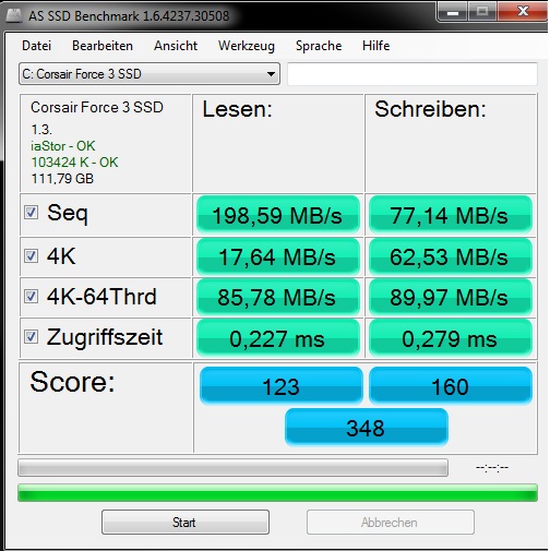 Kalinke, das is für ne Force 3 normal im AS SSD (nicht komprimierbare Daten). Benche mal mit ATTO (stark komprimierbare Daten) dort siehts besser aus.