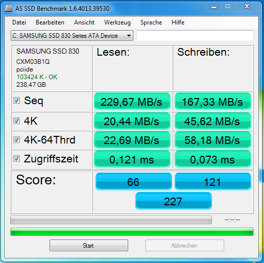 Die Intel 120 G SSD im Laptop ist mit sehr viel schlechteren Werten aus dem Benchmark gekommen.