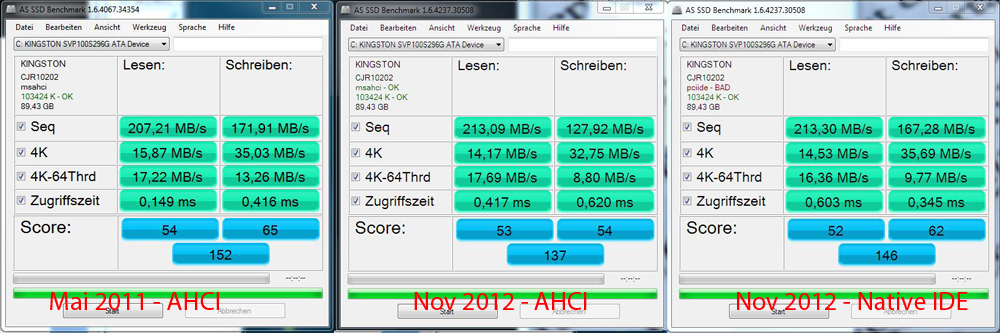 Das ist die 96GB Kingston, richtig? Deren Controller unterstützt kein NCQ, von daher sind die 4k_64 auch so schlecht und sogar schlechter als die 4k Werte und IDE hat gegenüber AHCI keinen Nachteil. Warum die seq. Schreibrate bei IDE jetzt aber so viel besser als unter AHCI ist, kann man nur vermuten: Da würde wohl irgendwas den Benchmarklauf gestört haben oder die SSD ist recht voll und die Daten wurden beim Test unter AHCI schlechter verteilt. Vermutlich würde bei mehreren Läufe in einem zeitlichen Abstand sowohl im IDE wie im AHCI Modus solch schankenden Schreibraten zustande kommen.