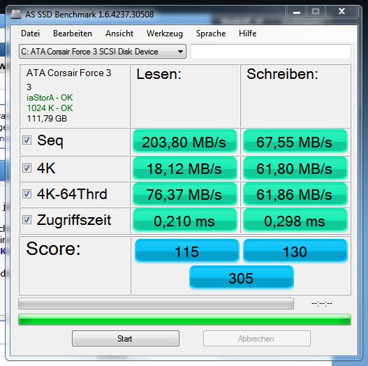 Hallo Rudolf, die Force 3 hat den Sandforcecontroller und asynchrones Nand. AS SSD bencht mit nicht komrimierbaren Daten, da kommt nicht mehr raus. Benche mal mit ATTO dann müßte sie die beworbenen Werte erreichen. ATTO bencht mit stark komprimierbaren Daten.