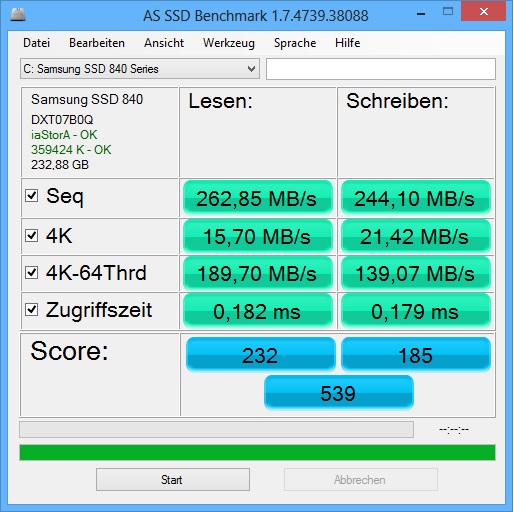 Merkwürdig ist auch, das die SSD in meinem System über SATA2 schneller ist als über SATA3, dort schafft sie 260 MB/s Leseleistung.
