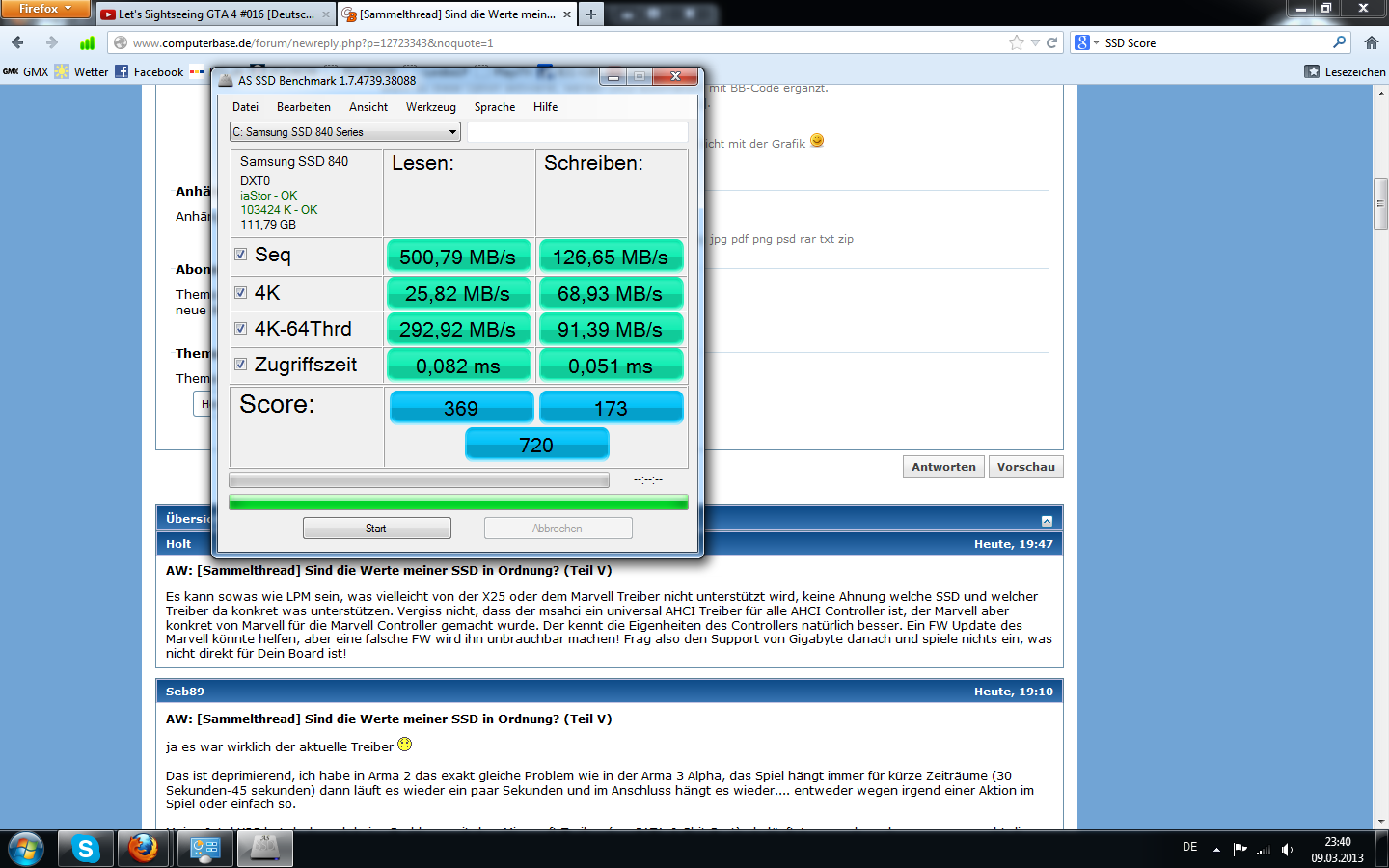 Habe gerade meine neue Samsung SSD 840 Pro 256 GB an mein Board angeschlossen. Dabei handelt es sich um ein Gigabyte 790FXTA-UD5, hab also die SSD am Marvel 9128 Controller bzw. den SATA-6Gbit Ports angeschlossen. Die teilt sich den Controller zusammen mit einer Intel X25-M G2 Postville 80GB