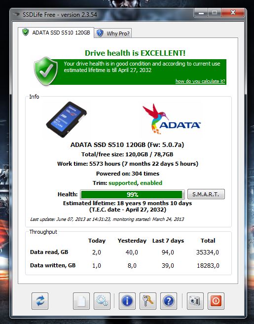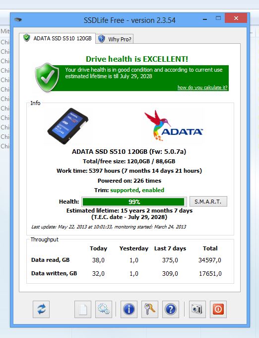 die aktuelle fw 5.0.7a erhöht ständig die lifetime anzeige in ssd life. bei fw 5.0.2a und 3.3.2 war das immer ein fester wert. in den release notes zur 5.0.7a stand was von improved trim operation und improved ssd stability. probleme sonst hab ich noch nie gehabt. sandforce und async hin oder her, das teil läuft super nur das mit der von tag zu tag höheren lifetime wundert mich halt.
