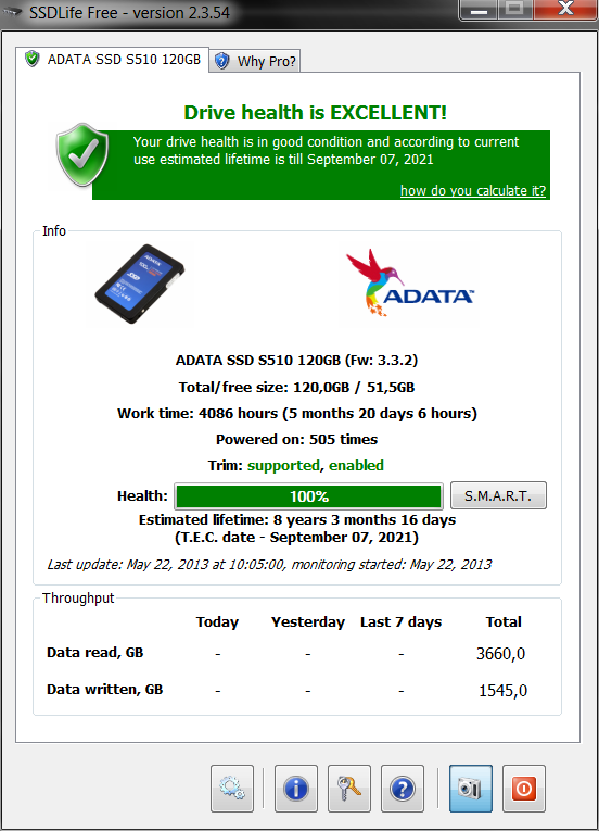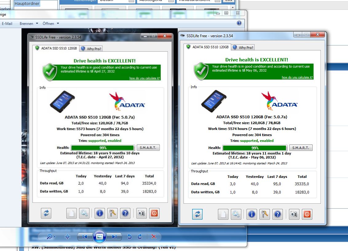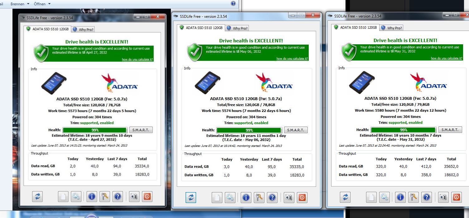 Die "Estimated Lifetime" ist aber um fast ein Monat kleiner geworden. Wäre interessant, ob man aus den Werten Rückschlüsse ziehen kann, wie das Programm aus den Werten dann zu einem Datum umrechnet?