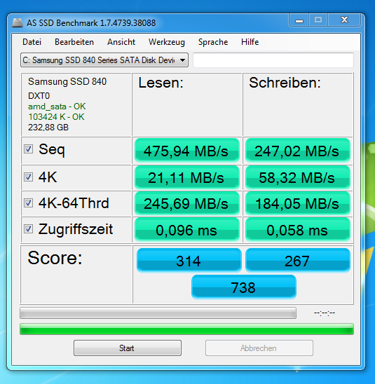 Ich habe mit AS SSD Benchmark meine SSD getestet und die Werte sind mehr als schlecht....ich weiss nur nicht mehr voran das liegen kann. Im Bios ist der Sata Port auf ACHI gestellt. Ich habe sogar damals extra Win 7 neu installiert und auf die SSD installiert.