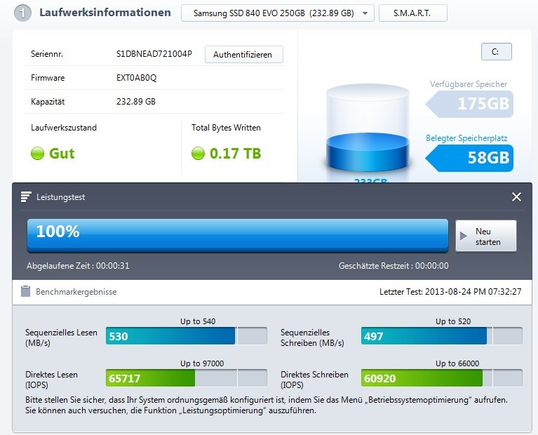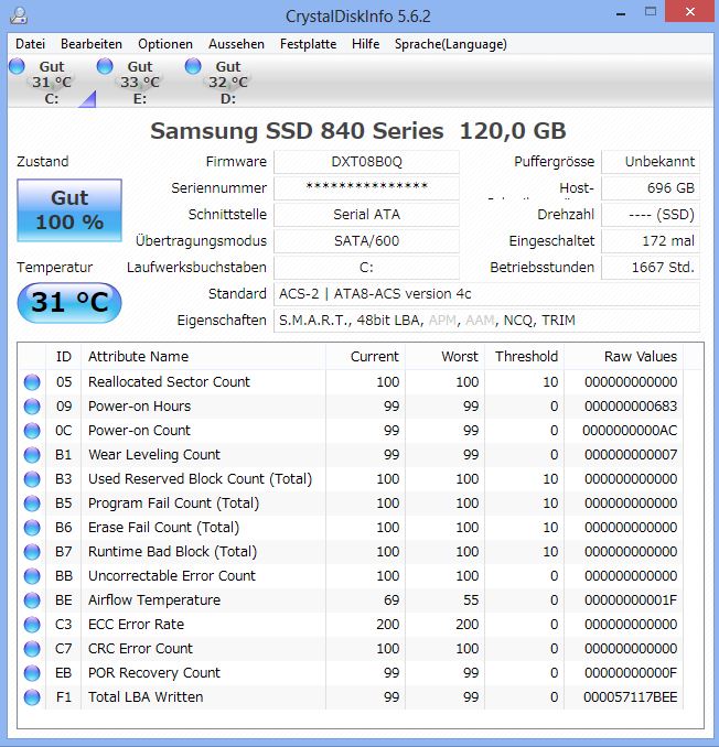 In der Eigenschaftsseite der SSD muss die obere Checkbox gesetzt, und die untere leer sein!