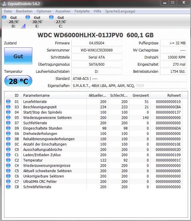 Das einzige worüber ich mir Gedanken machen würde, wäre die S-ATA-Kabel zu überprüfen und ggf. auszutauschen, insbesondere das von der 600GB WD Festplatte mit D, bzw. 13 CRC-Fehlern. (0-9 = 0-9, A=10, B=11, C=12, D ist dann also 13 von Hexadezimal zu Dezimal)