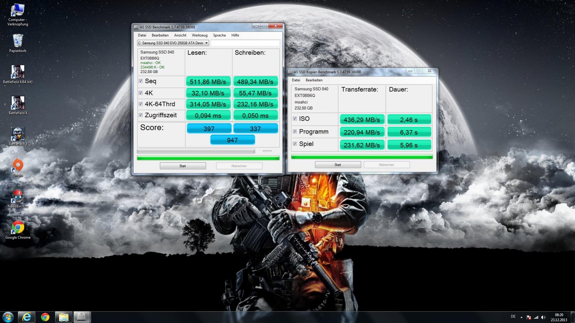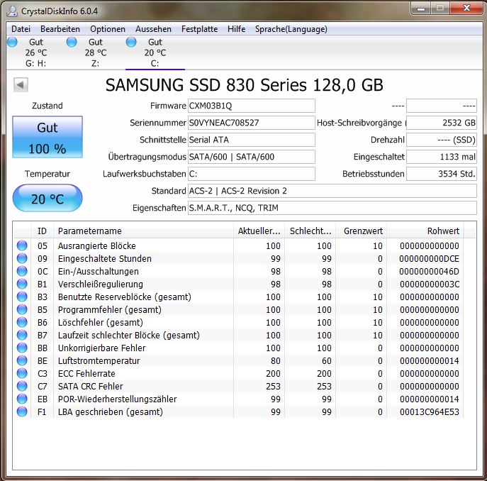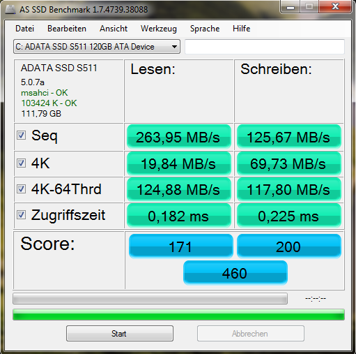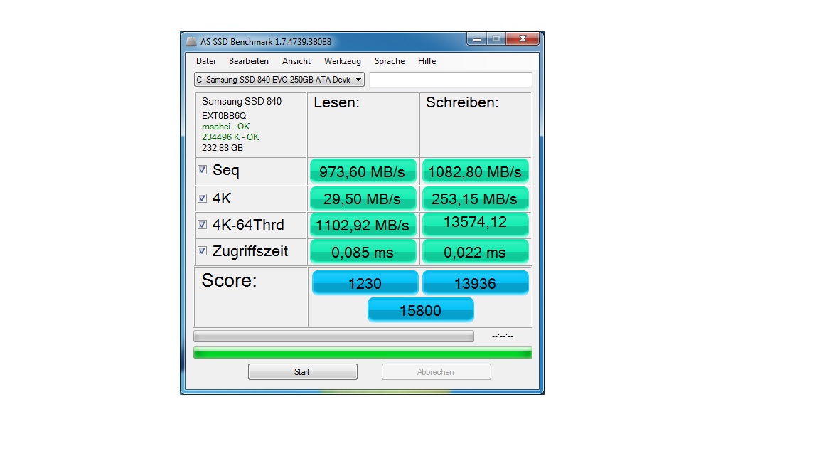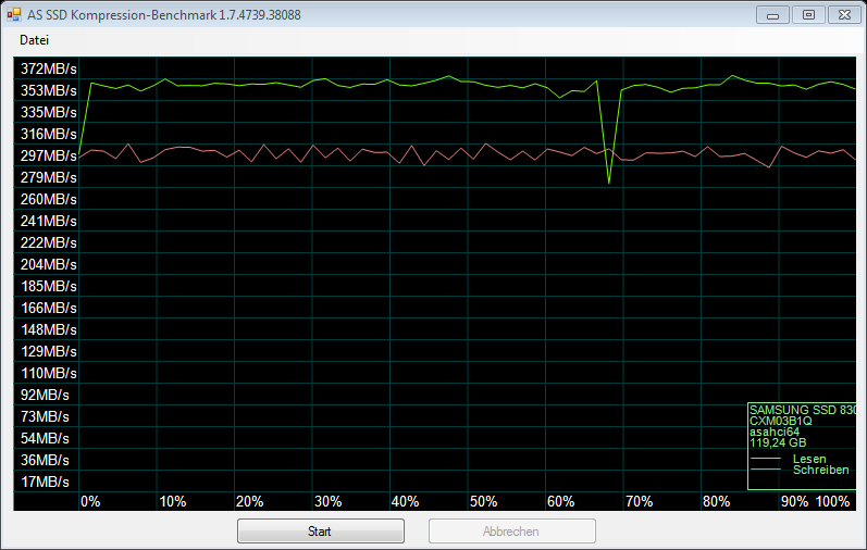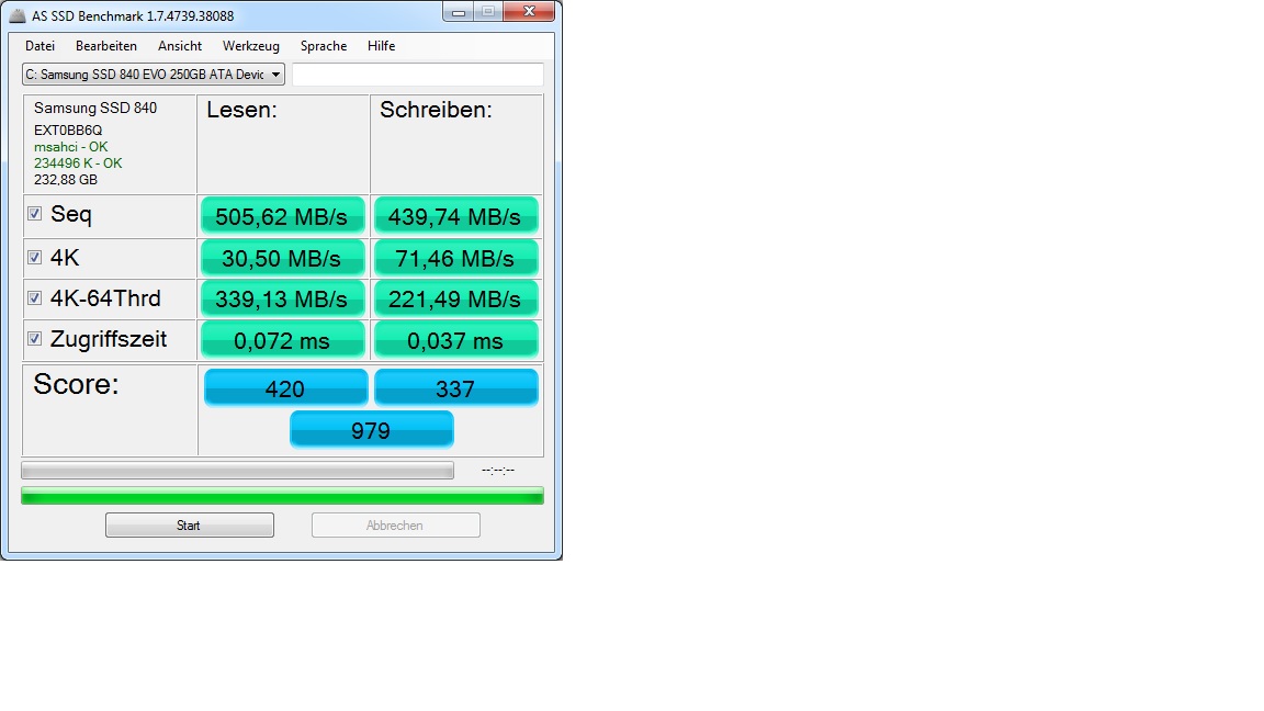 P.S.: Nicht wundern, beim zweiten Screen war der Intel-AHCI-Treiber aktiv, mit dem die Firmware der SSD nicht korrekt angezeigt wurde. War aber diesselbe. Die Geschwindigkeiten mit msahci und iastor sind bei mir auf diesem System und mit dieser SSD nahezu identisch.