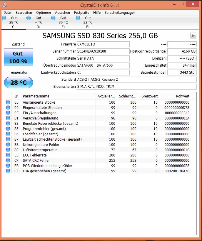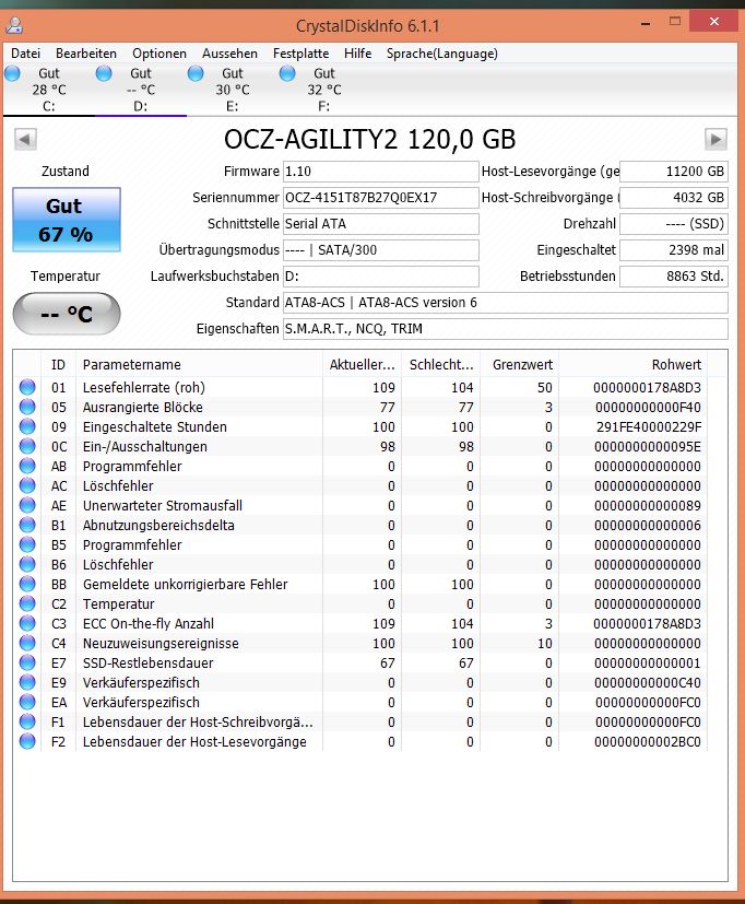 Der Eintrag in Reserved Block Count am Anfang ist ja anscheinend normal. Etwas Sorgen macht mir aber der hohe C3-Wert (Cumulative ECC Bit Correction Count), der sich inzwischen auch schon erhöht hat. Dabei habe ich die SSD noch gar nicht in der Windows-Datenträgerverwaltung initialisiert.