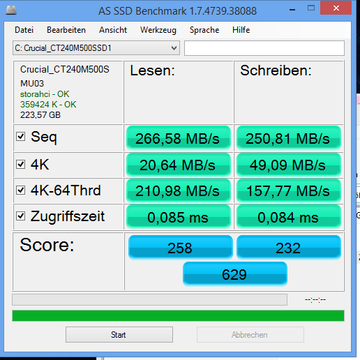 Bis auf den seq. Schreiben Wert ist alles OK. Der seq. Schreiben Wert sollte bei ~300MB/s liegen.