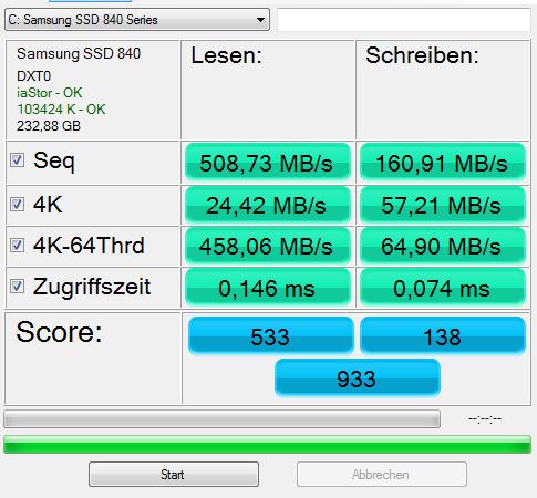 Hallo, ich habe in meinem HP 625 eine 256GB Crucial MX100 verbaut. Jetzt habe ich einen Benchmark laufen lassen lassen, hier das Ergebnis: