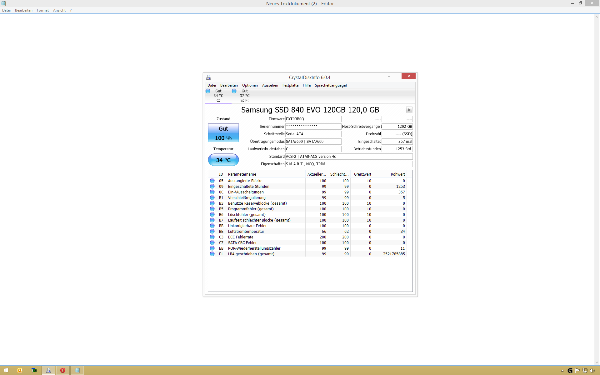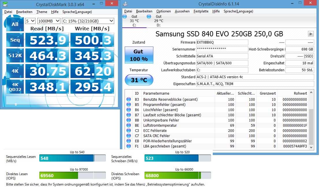 Hab seit ein paar Tagen meine SSD 840 EVO 250 GB als Systemplatte (Windows 8.1 Pro) eingebaut. Möchte hier auch mal meine Werte posten.