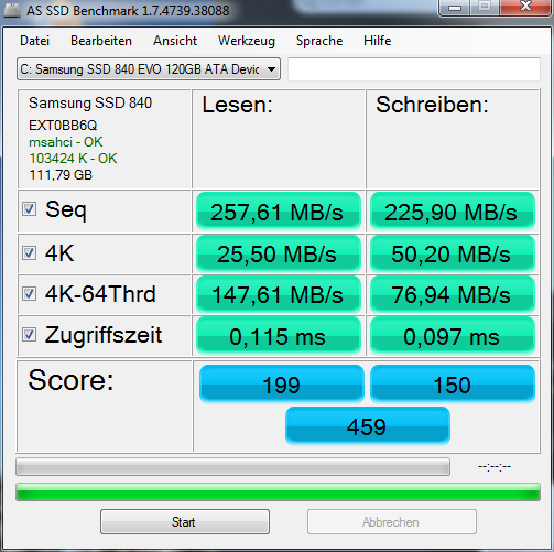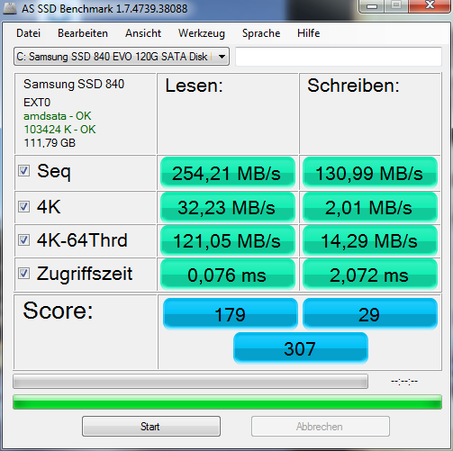 Wenn die stimmt oder nach Umstellung die Schreibraten, vor allem die 4k Schreibend nicht besser wird, kannst Du noch versuchen auf den MASHCI Treiber zu wechseln und wenn das auch nichts bringt, dann musst Du Windows neu installieren.