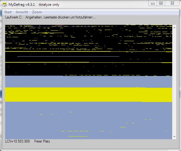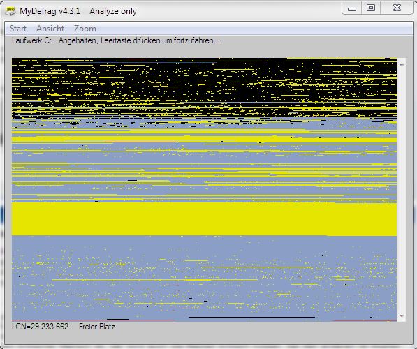 Ok, TRIM funktioniert also. Jetzt würde ich mal auf die Energiespareinstellungen achten (auch LPM und APM) und sehen ob es an der Fragmentierung liegen kann. Mache dazu mal eine Analyse mit MyDefrag, denn wenn keine ausreichend großen Lücken vorhanden sind wohin AS-SSD sein Testfile schreiben kann, dann fällt die Schreibrate auch ab, da ja keine langen sequentiellen Zugriffe stattfinden, sondern viele kleine zufälligen Zugriffe.