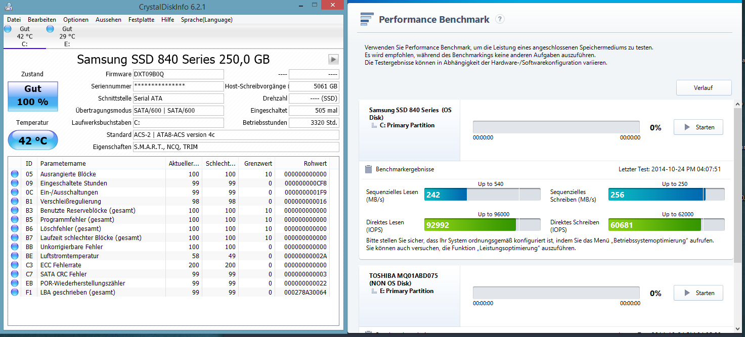 Achte bei Deiner 840er mal auf den Rohwert von C7, der zeigt 3 SATA CRC Fehler an. Das sind Probleme in der Kommunikation zwischen dem SATA Host Controller und dem Controller der SSD. Dafür ist praktisch immer das Kabel verantwortlich, was entweder lose oder defekt ist. Prüfe das also mal auf festen Sitz und sollte der Rohwert von C7 steigen, dann tausche es aus.