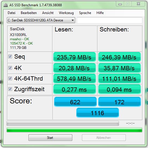 Bindl, die SSD hängt an einem SATA 3Gb/s Port, daher die Werte. Für 500MB/s muss man einen nativen SATA 6Gb/s Port haben. Die 4k_64 lesend sind so hoch, weil der Treiber da im RAM cacht, Windows nutzt ja normalerweise unbelegtes RAM als Disckcache. Das tritt gerade beim Microsofttreiber öfter auf und hat nichts zu sagen. Beim CrystalDiskMark gibt es das nicht, damit kannst Du ja auch mal benchen, da dürften maximal so 200MB/s bei 4k QD32 raus kommen, denn mehr geht über SATA 3Gb/s bei so kurzen Zugriffen aufgrund des damit verbundenen Overheads nicht.